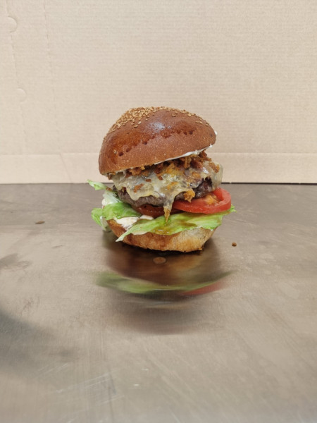 sezamová bulka, salát, rajče, hovězí maso 100g, karamelizovaná cibulka, cheddar, slanina, tatarská omáčka